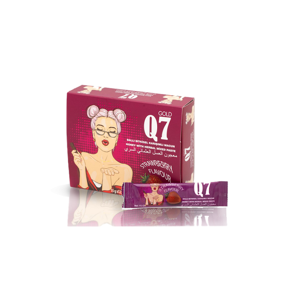 Gold Q7 Strawberry Flavor Honey 12 Sachet – a remarkable fusion of flavors designed specifically for women. This exceptional product presents a unique formula in the form of a honeyed paste, combining the indulgent richness of chocolate with the sweetness of strawberries. Each package contains 3 Gold Q7 Chocolate Turkish Honey sachets, each weighing 50 grams, providing you with a delightful treat and an array of benefits.